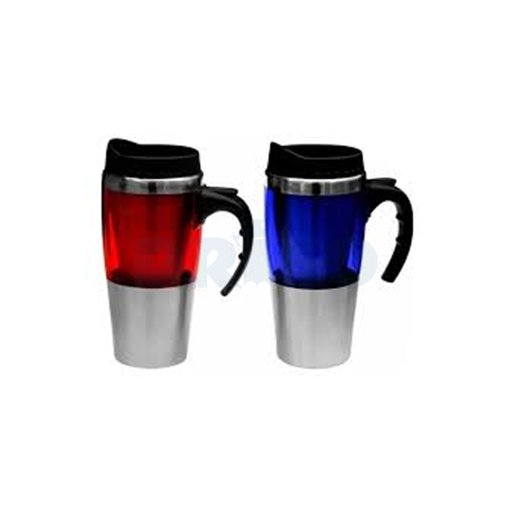 Descripción: Interior de metal, por fuera cuerpo de metal con recubriento en el medio de acrílico traslúcido de color (ver colores disponibles), asa y tapa de plástico negro. Capacidad: 450 ml. Colores: Azul y rojo.
