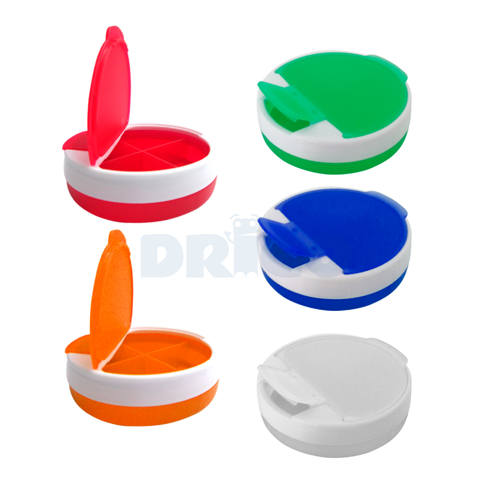 Descripción: Porta pastillas de plástico de forma circular con 4 Compartimientos.